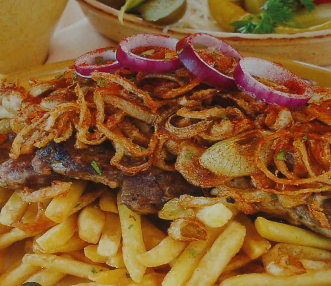 Glutén Tojás TejSertés tarja, Grillezett sertésszalonna, Barnamártás, Steak burgonya