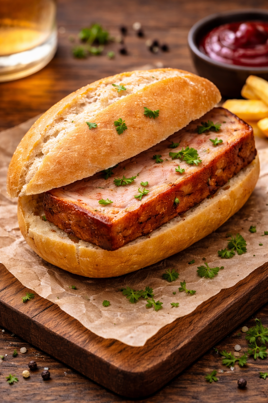 Glutén Tojás TejPirított baguette, Grillezett Fűszeres csirkecomb filé, Tükörtojás, Paradicsom, Feketeerdei sonka, Bacon, Jégsaláta, Majonéz, Hasábburgonya